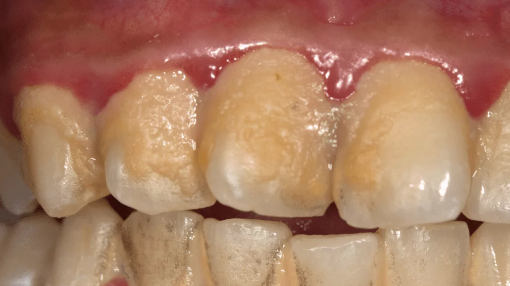 Teeth affected by AI are often not the bright, white shade that most people are used to. Instead, they can appear: