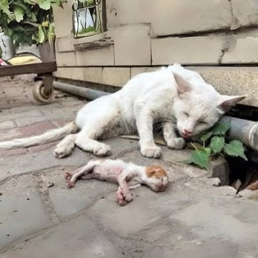 In a dark and desolate alley in a quiet part of the city, an elderly mother cat was crouched low, clutching her tiny kitten tightly against her body. Surrounded by the harsh realities of the streets, her eyes were filled with a mixture of fear, fatigue, and a profound sense of resolve. The weight of her exhaustion was visible, but her eyes also glistened with what appeared to be tears—a silent reflection of her deep concern. She had endured countless struggles, but the fear of losing her kitten, the one remaining treasure in her difficult life, was the most pressing worry on her mind.